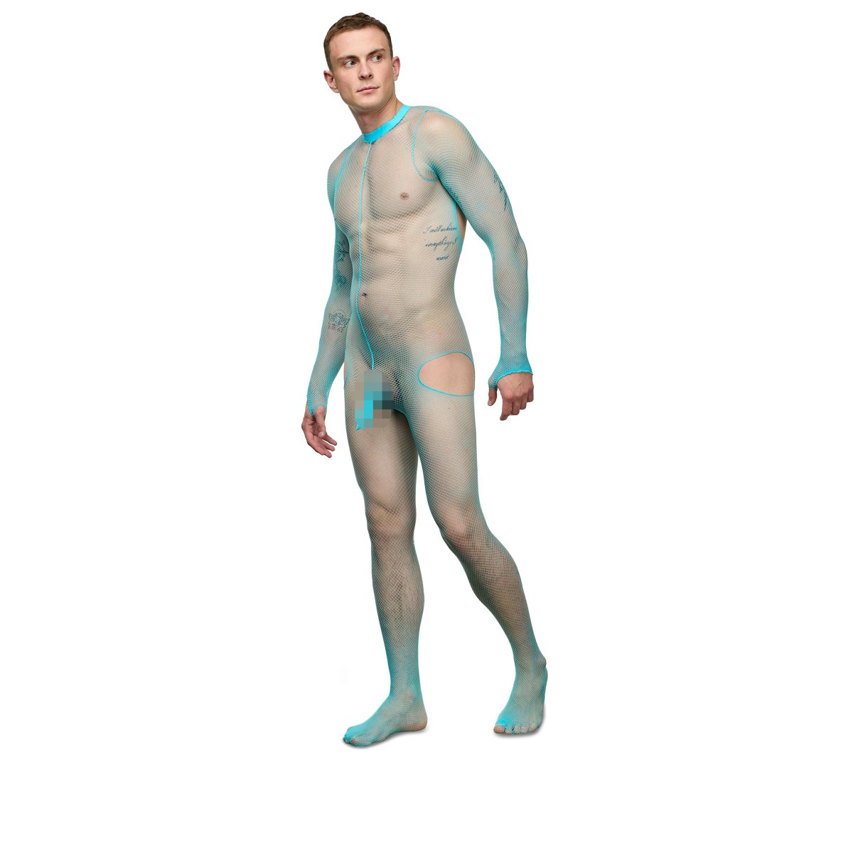 Мужской бирюзовый сетчатый кэтсьюит с интимным доступом.