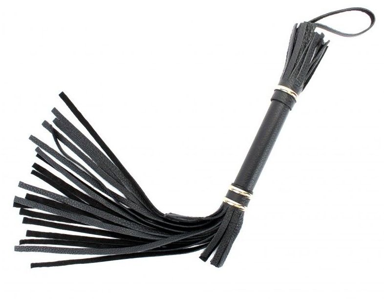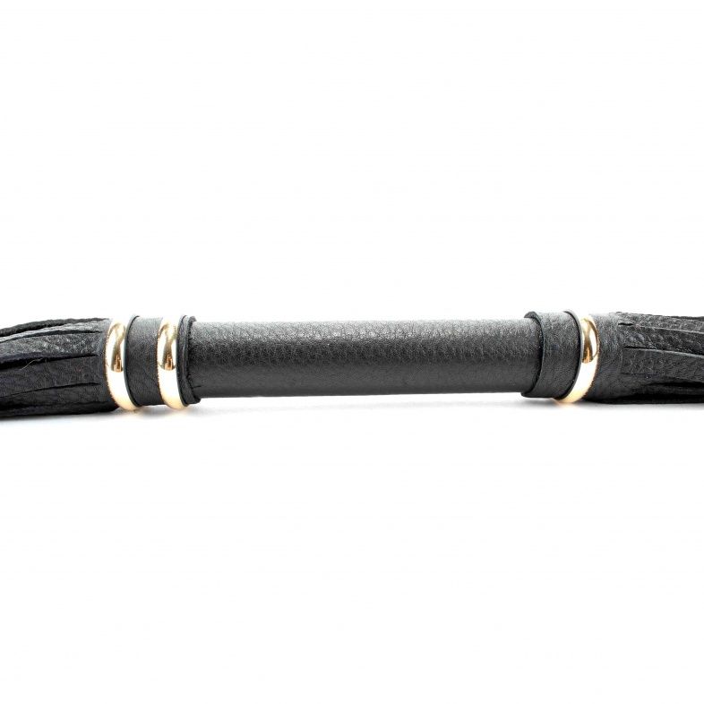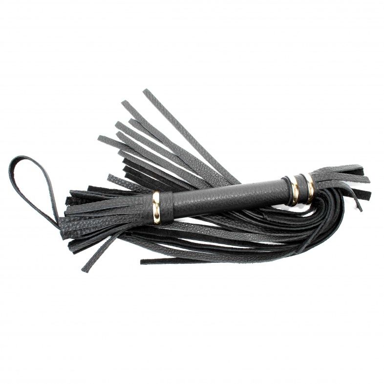 Аккуратная черная плетка, изготовленная из натуральной кожи. Имеет жесткую ручку, также покрытую кожей и украшенную золотыми кольцами. Имеется петля для удобного использования плети. Длина ручки - 17 см. Длина хлыстов - 27 см.