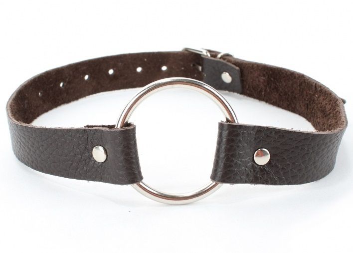 Коричневый кожаный кляп с металлическим кольцом.