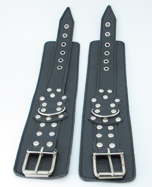 Кожаные наручники черного цвета. Украшены заклепками и соединяются между собой цепью с карабинами. Размер наручников регулируется при помощи застежки Ширина - 6 см. Длина цепочки - 15,5 см.