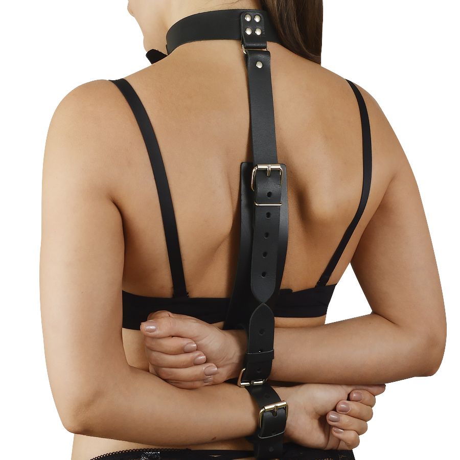 Комплект-фиксатор Новичок изготовлен из натуральной кожи и металлической фурнитуры. Изделие регулируется, что позволяет откорректировать размер под различный рост. Ошейник и наручники зафиксированы на основе (не съемные). Регулируются также металлическими пряжками.