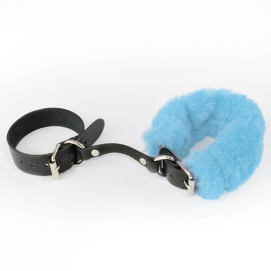 Ремешки наручников изготовлены из натуральной кожи и декорированы съемным искусственным мехом голубого оттенка.