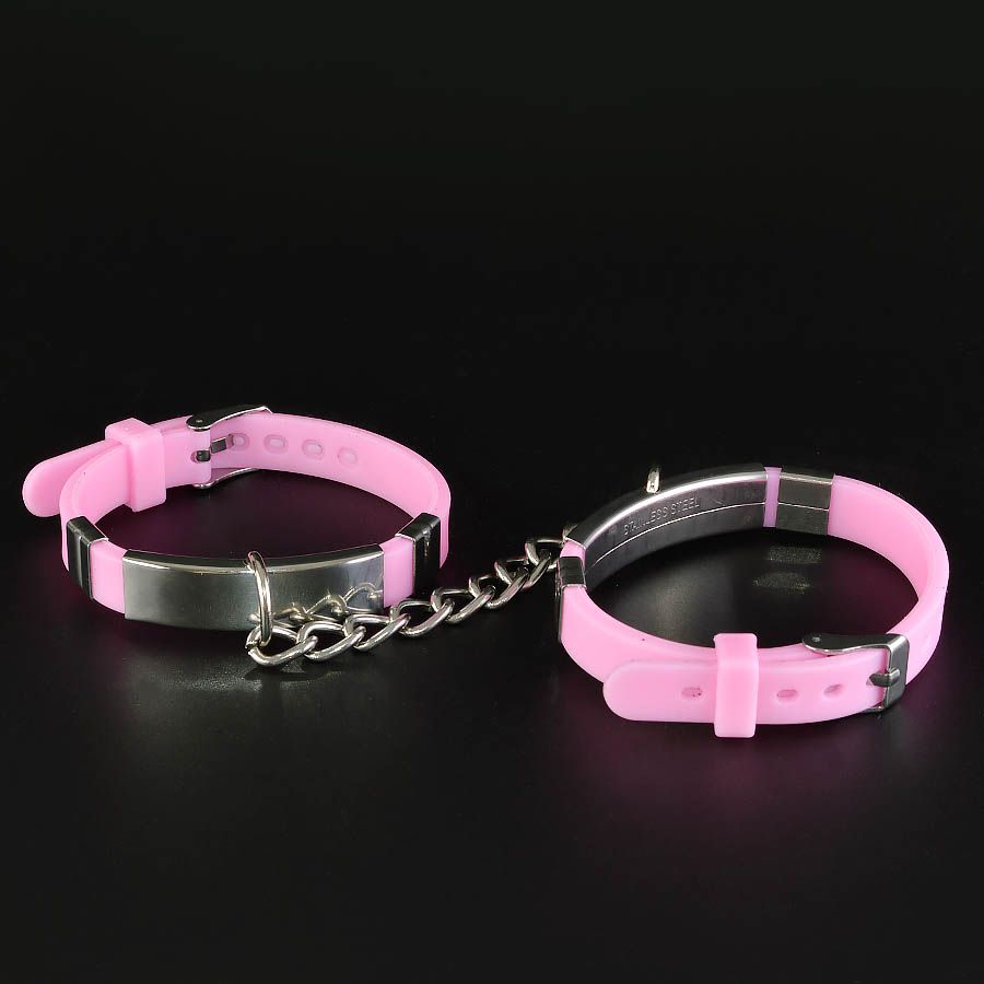 Наручники изготовлены из силикона розового цвета и соединены цепочкой. Длина манжеты - 22 см, ширина - 1 см.