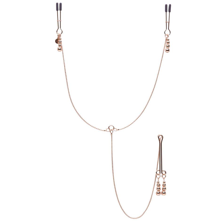 Зажимы для сосков и клитора. Металлические зажимы на соски с подвесками в виде цепочки из бусин. Степень сжатия сосков легко регулируется при помощи удобного механизма. Концы зажимов покрыты силиконовыми накладками для предотвращения повреждений сосков. Аксессуар обеспечит Вас новыми ощущениями и разнообразит сексуальную жизнь.Мини-уплотнительные кольца соединяют каждую цепь, открывая возможность дополнительного веса и удерживающих устройств.