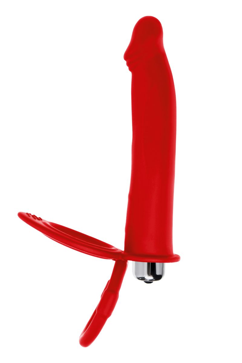 Насадка на пенис для двойного проникновения – это отличный выбор для любителей продвинутых сексуальных развлечений без участия третьих лиц. Встроенная вибропуля добавит ярких ощущений с помощью 10 режимов вибрации. Насадка надежно фиксируется на теле двумя кольцами, которые плотно обхватывают ствол пениса и мошонку. Это оказывает дополнительный эффект для продления полового акта, а партнер в это время получает в два раза больше удовольствия, что ускоряет приближение оргазма. Гладкий ствол и слегка изогнутая головка с дополнительным рельефом отлично стимулирует эрогенные зоны. Материал насадки – гипоаллергенный медицинский силикон. Рабочая длина - 13 см. Диаметр колец - 3,5 и 3,8 см.